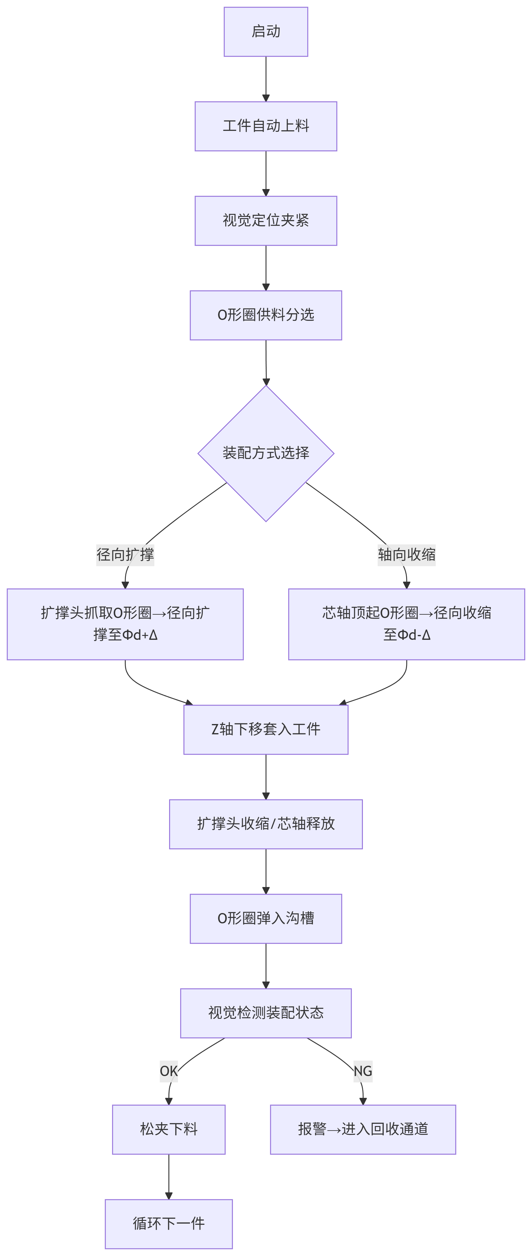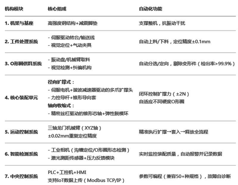 100mm)的痛點(diǎn),實(shí)現(xiàn)高效自動化生產(chǎn)的全自動化裝配機(jī)械設(shè)備。建議配合O形圈預(yù)處理設(shè)備(如冷凍收縮柜)使用,可進(jìn)一步降低裝配力30%。設(shè)備需在溫度23±2℃、濕度40-60%RH的潔凈車間運(yùn)行,避免橡膠件老化。此設(shè)計(jì)適用于汽車油封、風(fēng)電法蘭、航天密封環(huán)等大型O形圈裝配場景,投資回報(bào)周期通?!?8個月。" />
